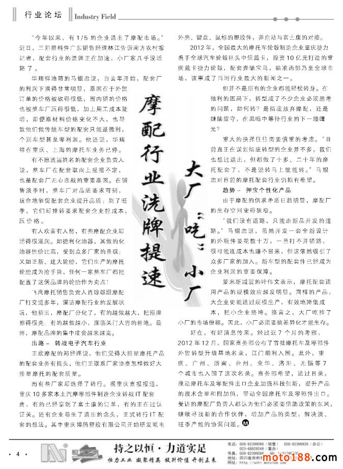 經過幾次改刊后的發行情況來看,我們這種根據市場變化靈活出刊的形式逐步被企業所認可。在發行上我們也是沒有打折扣,月出刊兩期后,黑白的內容要比過去豐富得多,可讀性也在增強。六月變單期后,我們另增加8頁黑白的文字信息內容,黑白每期為40頁。由于北方市場和南方市場淡旺季同期相反,所以在南方的淡季里,我們雜志在北方市場的發行數量將增加。不管南北市場淡旺不同,對我們來說,我們仍將一如既往地做好我們的工作。從今年6月份開始,我們工作人員將分別去福建、浙江、安徽和江西四省,走訪調研這四省的摩配市場,并將派送上萬份《外貿報》和工具書《配件生產企業大全》。同時,我們還將收集市場的最新資料,為下半年的《華東市場指南》做出書的準備工作。目前這項工作進展順利,廣告征集也在穩步進行。完成這些省份的調研工作,我們的信息采集工作也就到了收官階段。工作進展快的話,我們就會提前結束這本書的編排。在10月24日的南京全摩會上,大家就可以看到這本書了。