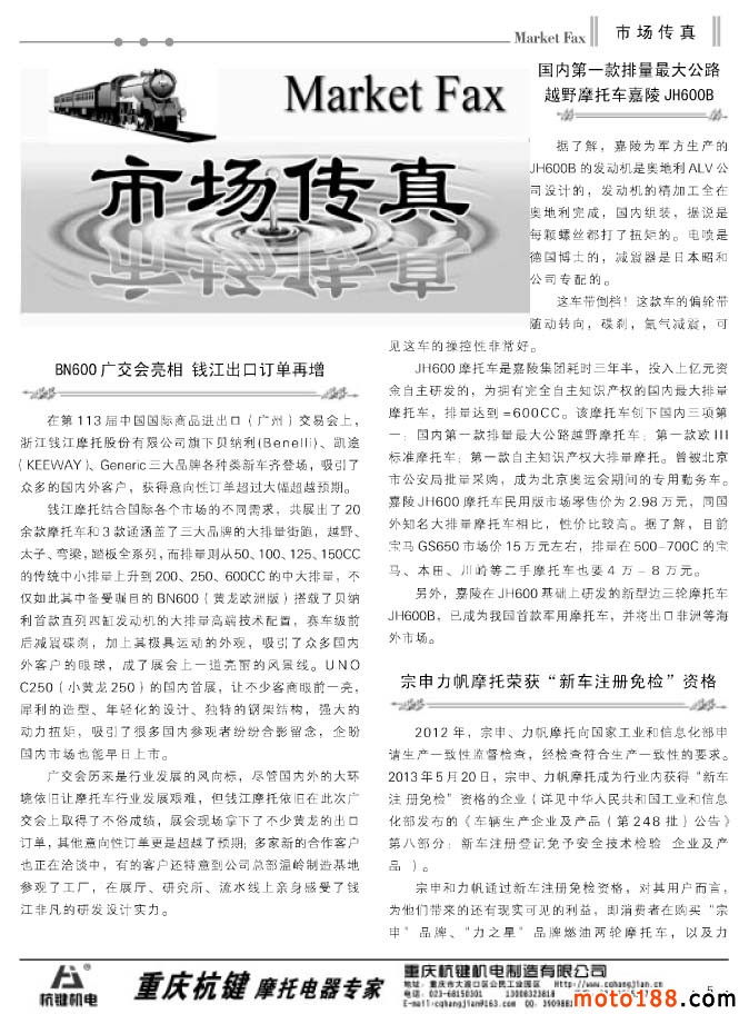 時節即將進入盛夏了,南方的天氣也越來越熱,國內的內銷市場,尤其是南方地區的市場將轉成淡季。根據我們今年的出刊計劃,我們從這個月也就是六月份開始至八月份每月出一期雜志。本期雜志是在六月中旬出刊;7月雜志將在七月上旬出刊,同時在中旬還會出刊今年的第三期《摩托車與配件外貿報》即夏季版(十月出刊秋季版);八月初出刊8月版;八月底至九月初出刊9月上半期雜志,十月中下旬出刊9月下半期雜志。請大家注意我們的出刊日期,及時 到我們的發行點領取。我們也會在moto188網站的公告欄及時通知大家雜志發貨的具體時間。