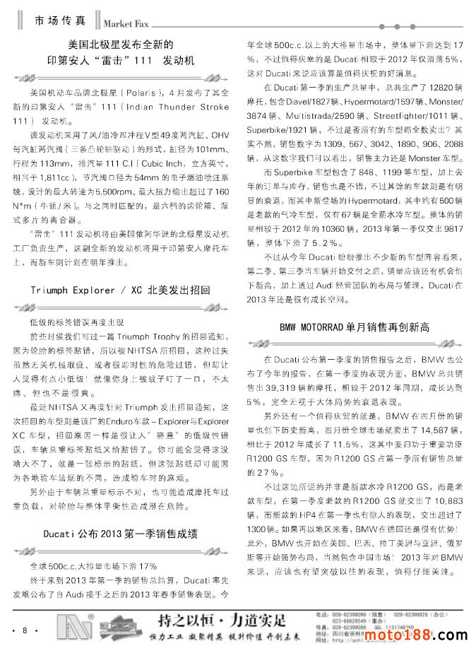 時節即將進入盛夏了,南方的天氣也越來越熱,國內的內銷市場,尤其是南方地區的市場將轉成淡季。根據我們今年的出刊計劃,我們從這個月也就是六月份開始至八月份每月出一期雜志。本期雜志是在六月中旬出刊;7月雜志將在七月上旬出刊,同時在中旬還會出刊今年的第三期《摩托車與配件外貿報》即夏季版(十月出刊秋季版);八月初出刊8月版;八月底至九月初出刊9月上半期雜志,十月中下旬出刊9月下半期雜志。請大家注意我們的出刊日期,及時 到我們的發行點領取。我們也會在moto188網站的公告欄及時通知大家雜志發貨的具體時間。