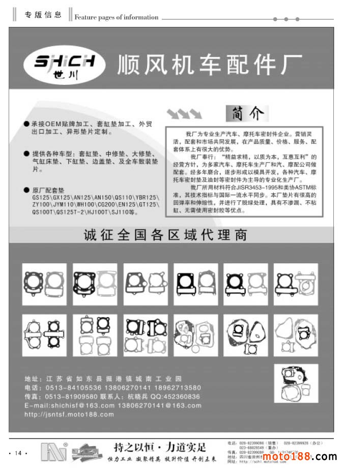 經過幾次改刊后的發行情況來看,我們這種根據市場變化靈活出刊的形式逐步被企業所認可。在發行上我們也是沒有打折扣,月出刊兩期后,黑白的內容要比過去豐富得多,可讀性也在增強。六月變單期后,我們另增加8頁黑白的文字信息內容,黑白每期為40頁。由于北方市場和南方市場淡旺季同期相反,所以在南方的淡季里,我們雜志在北方市場的發行數量將增加。不管南北市場淡旺不同,對我們來說,我們仍將一如既往地做好我們的工作。從今年6月份開始,我們工作人員將分別去福建、浙江、安徽和江西四省,走訪調研這四省的摩配市場,并將派送上萬份《外貿報》和工具書《配件生產企業大全》。同時,我們還將收集市場的最新資料,為下半年的《華東市場指南》做出書的準備工作。目前這項工作進展順利,廣告征集也在穩步進行。完成這些省份的調研工作,我們的信息采集工作也就到了收官階段。工作進展快的話,我們就會提前結束這本書的編排。在10月24日的南京全摩會上,大家就可以看到這本書了。