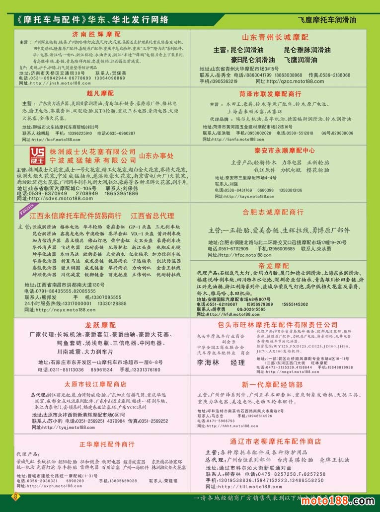 在這個淡季里,我們還將去西北和東北送書、送報上萬,走訪調研這些地區的市場。再次強調,我們送的書是今年上半年在濟南全摩會首發的新版《中國摩托車配件生產企業大全》,送的報紙是《摩托車與配件外貿報》。我們的雜志還是由全國各發行點直接發放給市場上的經營商戶。目前《大全》已完成在山東、河北、廣東和重慶等省市的主要市場的發行。今年年底之前完成對全國市場的投放。