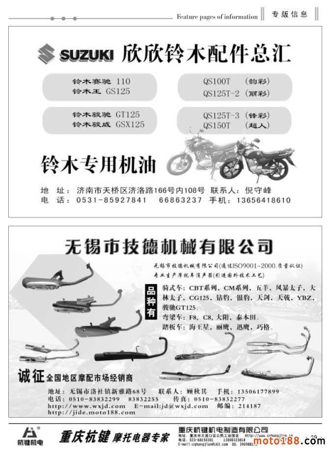 經過幾次改刊后的發行情況來看,我們這種根據市場變化靈活出刊的形式逐步被企業所認可。在發行上我們也是沒有打折扣,月出刊兩期后,黑白的內容要比過去豐富得多,可讀性也在增強。六月變單期后,我們另增加8頁黑白的文字信息內容,黑白每期為40頁。由于北方市場和南方市場淡旺季同期相反,所以在南方的淡季里,我們雜志在北方市場的發行數量將增加。不管南北市場淡旺不同,對我們來說,我們仍將一如既往地做好我們的工作。從今年6月份開始,我們工作人員將分別去福建、浙江、安徽和江西四省,走訪調研這四省的摩配市場,并將派送上萬份《外貿報》和工具書《配件生產企業大全》。同時,我們還將收集市場的最新資料,為下半年的《華東市場指南》做出書的準備工作。目前這項工作進展順利,廣告征集也在穩步進行。完成這些省份的調研工作,我們的信息采集工作也就到了收官階段。工作進展快的話,我們就會提前結束這本書的編排。在10月24日的南京全摩會上,大家就可以看到這本書了。