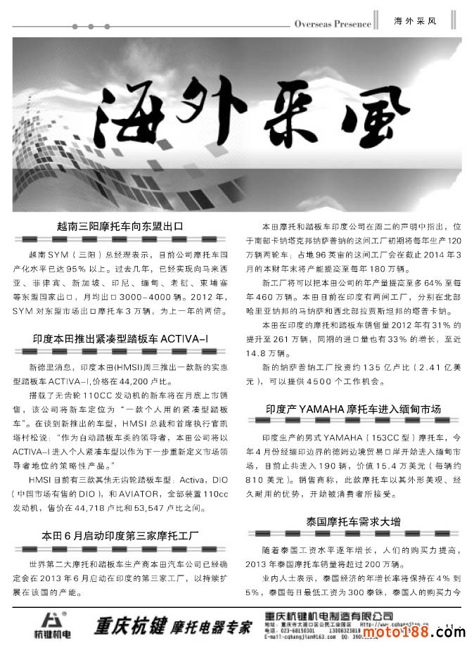 目前秋老虎終于收起了淫威,大部分地區(qū)氣候也慢慢地恢復到常態(tài),我們行業(yè)銷售的季節(jié)也開始了。我們雜志也從這個月開始出雙刊即半月一刊,由于是雙期,這一期的雜志相對較薄。完成全國摩配會議后,雜志還將根據行業(yè)具體情況作調整。受大環(huán)境的影響,尤其是國外市場的影響,今年的外貿形勢較去年相比形勢要差一些,在華南的外貿窗口也有所反映。從我們走訪的市場來看,盡管內銷不旺,我們的北方市場(西北、華北和東北)在疲軟之中發(fā)展,至少從外觀上來說,不少市場面貌比以往有新的變化,這是市場的亮點。行業(yè)的冬季是這樣,那行業(yè)的春天會怎么樣呢?今年的秋季全國摩配展示交易會將在十月下旬南京召開,從會展的招展形勢來看,行業(yè)依然踴躍參與,包括明年春天在西安的全國摩配會議。從這么多企業(yè)的參與來看,行業(yè)同仁依然有一種精神在支持他們,不管市場的風風雨雨,我自巋然不動。