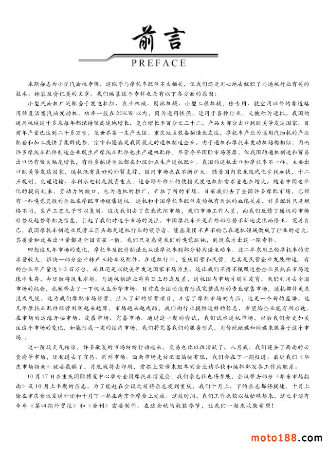 本期《摩托車與配件》雜志為小型汽油機專輯,這似乎與摩托車配件不太相關,但我們還是用心地去組織了與通機行業有關的技術、標準及資訊類的文章。我們編纂這個專輯也是有以下各方面的原因: