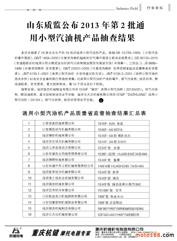 11 山東質監公布2013年第2批通用小型汽油機產品抽查結果