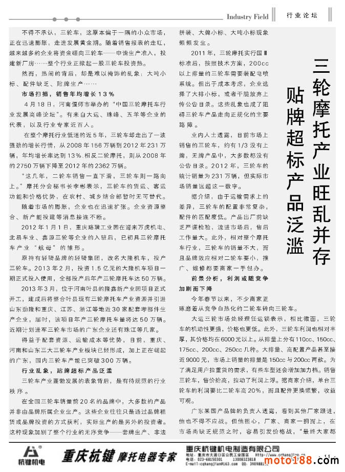 繼上期雜志我們做了小型通機的專題資訊報道之后,市場反映很好,這一期我們做了三輪摩托車的專題。三輪摩托車是今年摩托車市場的亮點,在二輪車市場整體下滑的狀況下,今年三輪摩托車依然逆勢增長。從現(xiàn)有統(tǒng)計數(shù)據(jù)看,今年增長幅度大約在13%左右,總產(chǎn)量將超過500萬輛。目前已經(jīng)形成以河南、重慶、廣東、山東等主要產(chǎn)區(qū),江蘇的淮海宗申是全行業(yè)最大的三輪車制造企業(yè),今年產(chǎn)銷量竟達到70多萬輛。目前三輪車市場正是黃金年代,我們的配件制造企業(yè)有許多配件和三輪摩托車是相同的,大家不妨關注這個新興的面向廣闊農(nóng)村的市場。這些新的產(chǎn)業(yè)帶需要新的配套鏈,愿你們也成為這個產(chǎn)業(yè)鏈上的鏈節(jié),對從事摩托車配件產(chǎn)業(yè)的企業(yè)來說,這也是一個新的商機。今年我們?nèi)チ嗽S多市場,有些地方已經(jīng)形成了單獨的三輪車市場,一般摩配市場也增加了三輪車配件經(jīng)營的門市,摩托車業(yè)不僅要向深度進軍,也要橫向地向?qū)挾劝l(fā)展。作為輿論導向的媒體,我們也要向行業(yè)輸送正能量,為企業(yè)生產(chǎn)和經(jīng)營出謀劃策。我們通過組織系列的資訊,讓企業(yè)能對新興的產(chǎn)業(yè)有個大致地了解,為企業(yè)的決策起到參謀作用。我們真誠地希望,摩托車業(yè)的所有企業(yè)都能在這個行業(yè)健康有序地發(fā)展成長,共同壯大。