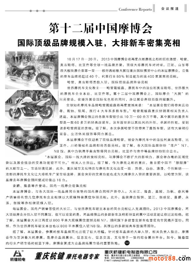 本次雜志因為要參加10月17-20日在重慶國際博覽中心舉辦的第十二屆中國國際摩托車博覽會,在這個展會上我們還將《中國摩托車配件華東市場指南》帶到會上發行,因而我們在過完中秋節后,工作就十分繁忙。為了能保證及時參展,我們都在趕點,這之中還包括國慶假日,印刷廠還要放假,江蘇到重慶的在途運輸時間等。為了兌現我們出版發行的承諾,我們也只有努力工作。