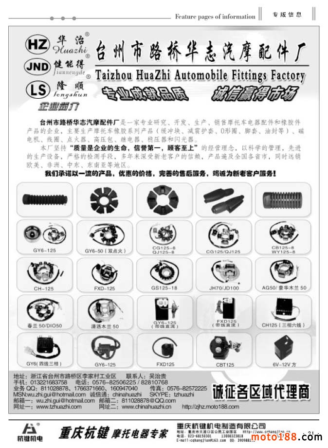 本次雜志因為要參加10月17-20日在重慶國際博覽中心舉辦的第十二屆中國國際摩托車博覽會,在這個展會上我們還將《中國摩托車配件華東市場指南》帶到會上發行,因而我們在過完中秋節后,工作就十分繁忙。為了能保證及時參展,我們都在趕點,這之中還包括國慶假日,印刷廠還要放假,江蘇到重慶的在途運輸時間等。為了兌現我們出版發行的承諾,我們也只有努力工作。