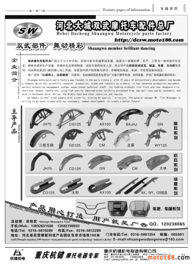 本次雜志因為要參加10月17-20日在重慶國際博覽中心舉辦的第十二屆中國國際摩托車博覽會,在這個展會上我們還將《中國摩托車配件華東市場指南》帶到會上發行,因而我們在過完中秋節后,工作就十分繁忙。為了能保證及時參展,我們都在趕點,這之中還包括國慶假日,印刷廠還要放假,江蘇到重慶的在途運輸時間等。為了兌現我們出版發行的承諾,我們也只有努力工作。
