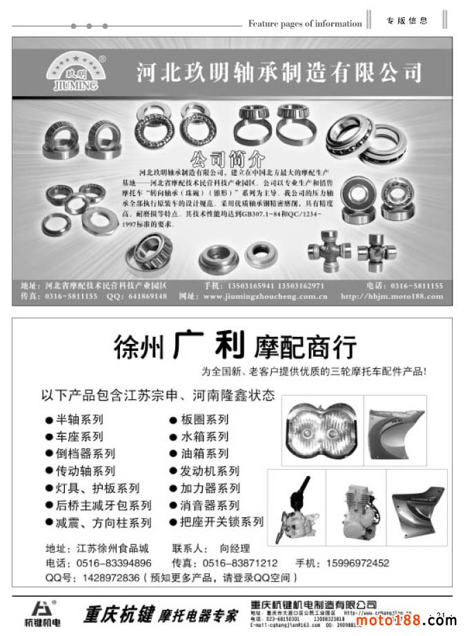 繼上期雜志我們做了小型通機的專題資訊報道之后,市場反映很好,這一期我們做了三輪摩托車的專題。三輪摩托車是今年摩托車市場的亮點,在二輪車市場整體下滑的狀況下,今年三輪摩托車依然逆勢增長。從現有統計數據看,今年增長幅度大約在13%左右,總產量將超過500萬輛。目前已經形成以河南、重慶、廣東、山東等主要產區,江蘇的淮海宗申是全行業最大的三輪車制造企業,今年產銷量竟達到70多萬輛。目前三輪車市場正是黃金年代,我們的配件制造企業有許多配件和三輪摩托車是相同的,大家不妨關注這個新興的面向廣闊農村的市場。這些新的產業帶需要新的配套鏈,愿你們也成為這個產業鏈上的鏈節,對從事摩托車配件產業的企業來說,這也是一個新的商機。今年我們去了許多市場,有些地方已經形成了單獨的三輪車市場,一般摩配市場也增加了三輪車配件經營的門市,摩托車業不僅要向深度進軍,也要橫向地向寬度發展。作為輿論導向的媒體,我們也要向行業輸送正能量,為企業生產和經營出謀劃策。我們通過組織系列的資訊,讓企業能對新興的產業有個大致地了解,為企業的決策起到參謀作用。我們真誠地希望,摩托車業的所有企業都能在這個行業健康有序地發展成長,共同壯大。