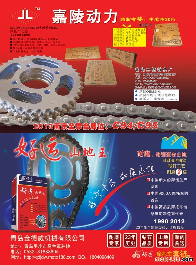 第三十三屆秋季全摩配也將于本月24-26日在南京國際會展中心召開,這是行業秋季大點兵。按照組委會的要求,大會的會刊將在本月15日抵達展館,所以也必須在國慶過后就得送去印刷。在今年秋季南京全摩會,我們還將為參會企業和觀展的經銷商,贈送新版《華東市場指南》,由廣州工作站承制的《廣州市場導購指南》,今年第三期《摩托車與配件外貿報》,今年十月上、下期《摩托車與配件》雜志,以及部分庫存書——《中國摩托車配件生產企業大全》。《配件生產企業大全》上半年在濟南首發,目前除湖南、湖北及山西、廣西、河北部分市場沒有發放外,其余市場基本都是送書上門;還有部分省級市場由雜志發行點代理發送;沒有收到這本書的以及不在摩配市場的企業請到我們南京展位C89領取;還有《華南、三北、西南》三個市場的指南,也在會上發送。因為庫存的書不多,需要這些書的企業請盡量早去我們展位領取,送完即止。
