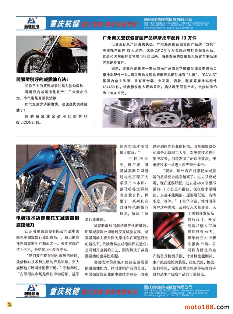 和這些歷經(jīng)風(fēng)雨在摩配行業(yè)堅(jiān)守的同仁們一樣,我們也煉得自信與從容。新的一年我們雜志以全新的面貌出現(xiàn),我們采用全彩色出刊,同時(shí)將我們的服務(wù)對(duì)象橫向延伸。與我們的同仁一樣,立足摩配,橫向拓展,內(nèi)外兼修,努力做好雜志,除了提升外觀品相,更是注重在內(nèi)容上的變化。每期雜志用十頁(yè)左右的文字來(lái)廣角掃描我們摩托車(chē)配件行業(yè)的子行業(yè),這一期推出的是減震器專題。上一期化油器專題出刊以后,不光受到市場(chǎng)的歡迎,有些企業(yè)還把我們的雜志認(rèn)真地收藏保存好,因?yàn)橛胁簧傩畔?duì)于他們的生產(chǎn)、經(jīng)營(yíng)都有一定幫助。對(duì)我們來(lái)說(shuō)也是迫使我們更深入地了解摩配的各個(gè)子行業(yè)。自從前年摩托車(chē)行業(yè)開(kāi)始強(qiáng)制提高排放標(biāo)準(zhǔn)以后,我們片面地認(rèn)為化油器這個(gè)行業(yè)會(huì)被電噴完全取代,這個(gè)產(chǎn)業(yè)是不是已經(jīng)步入到夕陽(yáng)期?通過(guò)編排我們較深刻的對(duì)這一產(chǎn)業(yè)有所了解,制造之地一派欣欣向榮的景象,在我們摩托車(chē)業(yè)需求量減少之時(shí),我們的制造廠已經(jīng)在通機(jī)領(lǐng)域干得風(fēng)生水起,有不少?gòu)S即使擴(kuò)大產(chǎn)能也供不應(yīng)求。當(dāng)?shù)氐胤秸矎倪@個(gè)產(chǎn)業(yè)得到許多實(shí)惠,一個(gè)雙贏的局面,這就是產(chǎn)業(yè)的正能量。其實(shí)市場(chǎng)如何變幻,總有一批做得好的龍頭企業(yè)在努力工作,打造自己的名牌,眼光不僅僅局限面前,更多地瞄準(zhǔn)了國(guó)際市場(chǎng)。中國(guó)制造能漂洋過(guò)海,被國(guó)外消費(fèi)者所接受,正是這樣一批行業(yè)精英為國(guó)家和民族在努力。