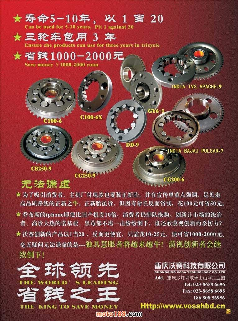 新的變革之后的《摩托車與配件》已經出了四個配件子產業的專題,通過這種形式的變革,我們對摩托車配件的微觀行業也有了越來越深入的了解。每一個子行業也都有做得不錯的龍頭企業,他們在這個子行業里通過橫向地拓展,觸角伸得也較廣泛。比如這一期是鏈條專題,其實不光摩托車用,電動車、汽車、工業機械....只要需要傳動的都有鏈條的身影。因而許多廠的產品也涉及了多行業,但是我們僅選擇與我們產業有關的產品做一般的技術報道;前沿行業作泛泛報道;市場運用方面則是盡可能以廣角報道。以前一些企業也在我們雜志上做過宣傳,因為我們認識水平淺,不容易突出重點品牌企業,因而在宣傳服務上也流于常規。但是通過這期專題后,我們了解到,像東華、恒久、順峰、雙獅、征和等都是這個行業的龍頭企業,而且這些龍頭企業后勁十足。他們不光在擴大產能生產;更是投入了相當的精力在搞科研;抑或引進國外的先進技術,不光在做大更是在做強,假以時日,他們也會在國際市場上占有一席之地。我們對這些企業充滿敬意,他們是民族工業的脊梁。雖然納稅沒有房地產企業多,也沒有金融和地產業的風光,但他們沒有固步自封,也不滿足現狀,帶著創新和發展的精神趕德超日超美,縮短與國際水平的差距,也正是因為有許多像這樣的實體產業,中國制造才能真正的做強。那些只制造虛的龐大GDP的、靠吸吮實體產業汁水而滋潤的和靠壟斷而光鮮的行業,在他們面前是多么的不堪。