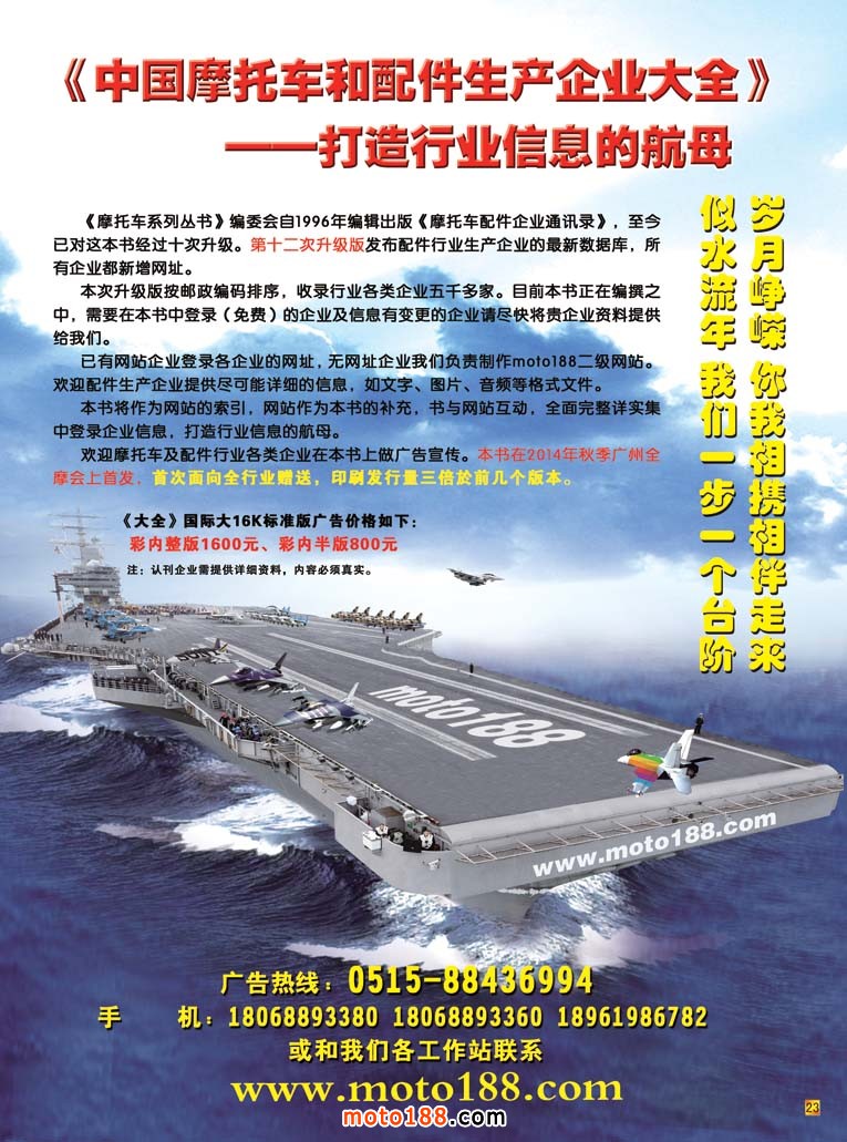 今年下半年我們將根據全摩會的地址變動而變動,下半年我們出版兩本書籍——《華南(廣東、海南)市場指南》、第十二次《中國摩托車配件生產業大全》升級版。廣州是中國摩托車配件的出口窗口,《華南版》廣州部分內容繼續用中英文雙語出版。