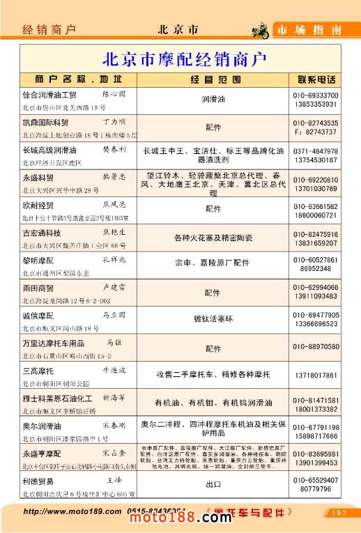 下版為《中國(guó)摩托車配件·西南市場(chǎng)指南》,包括重慶、云南、貴州、四川及陜西省四省一市地區(qū),收錄二千二百多家配件銷售企業(yè)匯總成書(shū),本書(shū)所有資料將是我刊在2011年冬及2012年春收集匯總更新整理的最新最準(zhǔn)確的市場(chǎng)第一手資料。