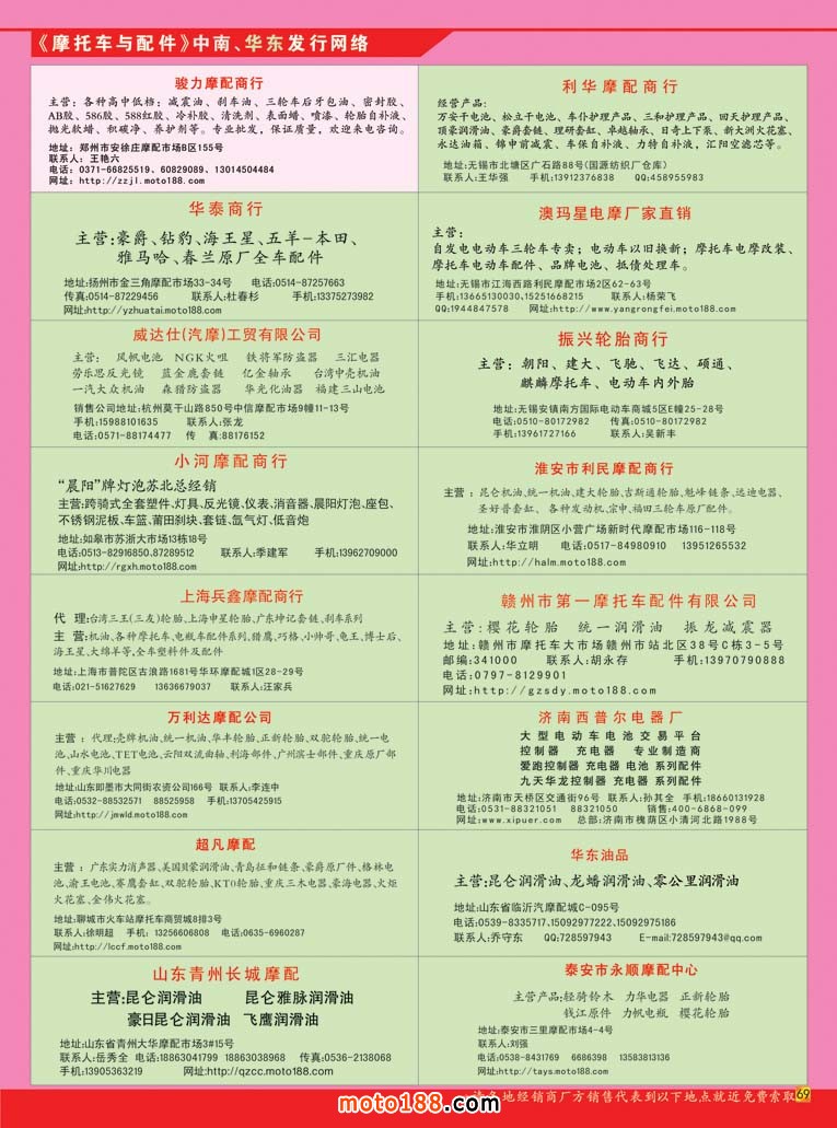 全摩會還有2個多月就在廣州召開了,這次會上我們將奉獻給大家的是第12次升級的《中國摩托車配件生產企業大全》在這本書中。我們新增了目錄銷售排名前10-20名的摩托車整車生產企業,二輪電動車生產企業、燃油和電動三輪生產企業的名錄,方便大家在增加經營的同時,有所選擇和參考。《華南市場指南》含廣東和海南兩省市場經銷商戶的資料,其中的廣州白云區羅沖圍一帶的市場是用中英文雙語編排,方便外商的閱讀;其余例行的十一期雜志和外貿報紙;另外還有部分華東和西北地區的新的市場指南(已經在南京和西安會議首發)。如果有興趣從事新能源汽車業務的企業也可拿到《新能源車》雜志。這是我們新出的雜志,具體可去moto189網站上瀏覽到全部的內容,在此不多贅述。記住廣州再見,帶上你的名片到1075展位領書去!
