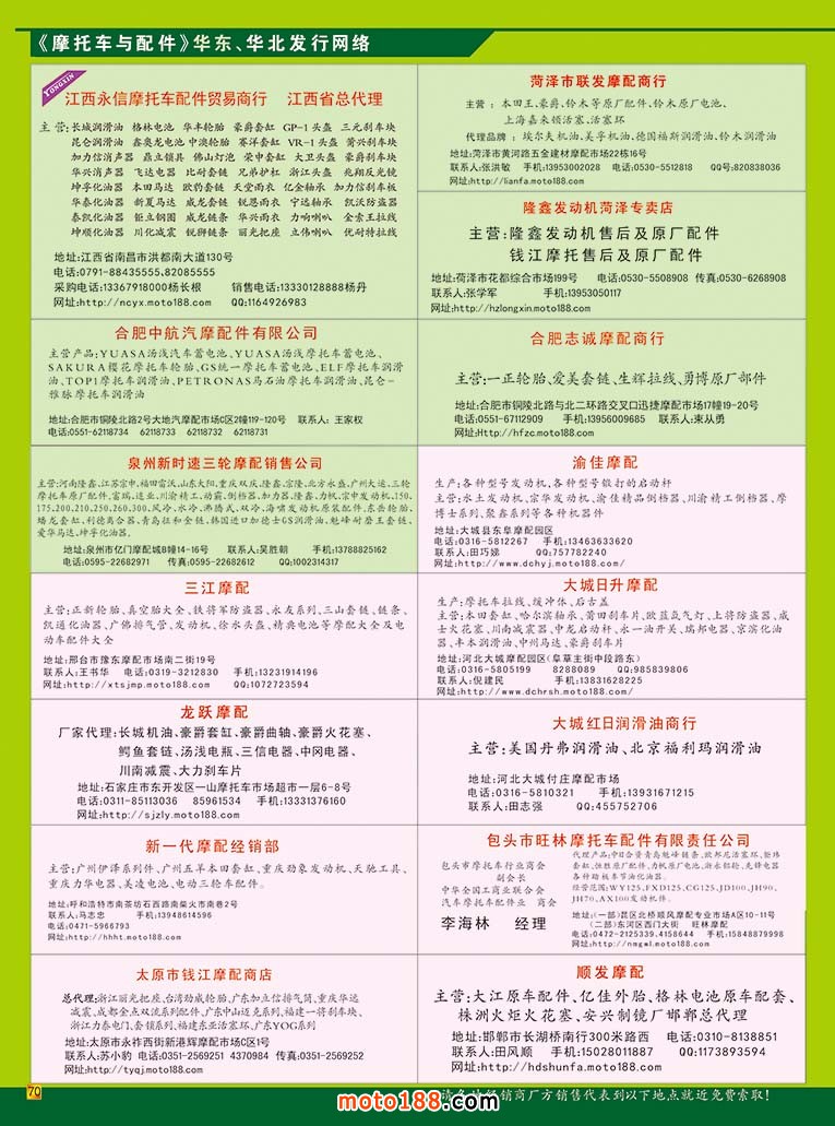 全摩會還有2個多月就在廣州召開了,這次會上我們將奉獻給大家的是第12次升級的《中國摩托車配件生產企業大全》在這本書中。我們新增了目錄銷售排名前10-20名的摩托車整車生產企業,二輪電動車生產企業、燃油和電動三輪生產企業的名錄,方便大家在增加經營的同時,有所選擇和參考。《華南市場指南》含廣東和海南兩省市場經銷商戶的資料,其中的廣州白云區羅沖圍一帶的市場是用中英文雙語編排,方便外商的閱讀;其余例行的十一期雜志和外貿報紙;另外還有部分華東和西北地區的新的市場指南(已經在南京和西安會議首發)。如果有興趣從事新能源汽車業務的企業也可拿到《新能源車》雜志。這是我們新出的雜志,具體可去moto189網站上瀏覽到全部的內容,在此不多贅述。記住廣州再見,帶上你的名片到1075展位領書去!