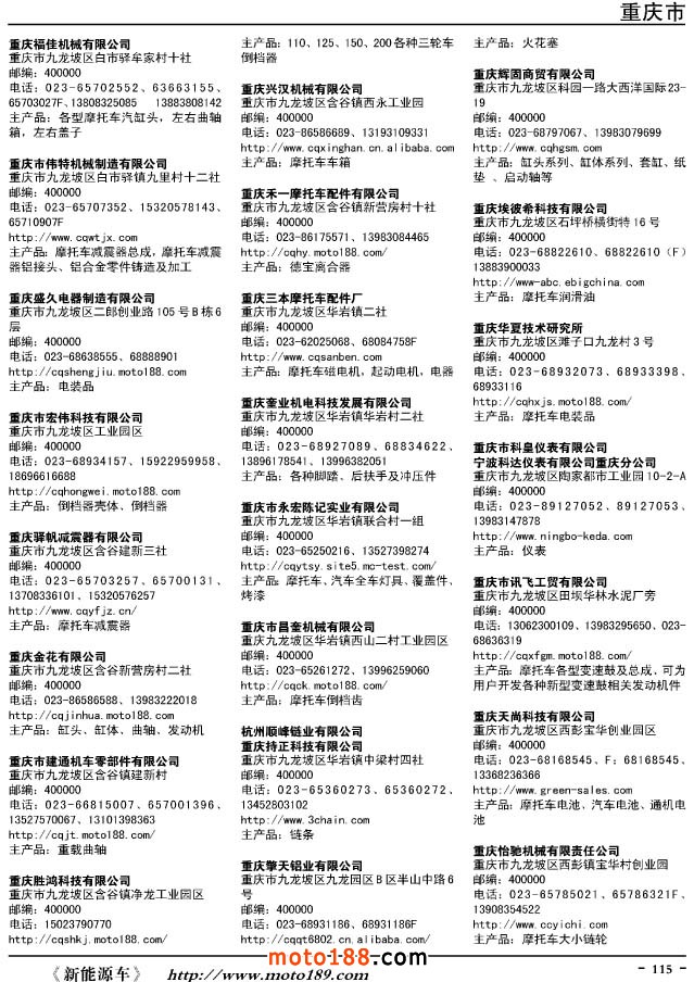 這兩年行業調整力度非常大,為了確保我們提供的信息準確性,我們本著寧缺毋濫的原則,不去圖虛的數量。目前摩托車與配件行業的不少經銷商是跨行業經營的,所以我們在本書中增加了部分摩托車整車廠、電動車生產廠、機動三輪車制造廠。所選的這些企業都是這個行業具有影響力的品牌企業,是為了大家在使用這本書時,獲取相關的延伸產業更多的實用信息。