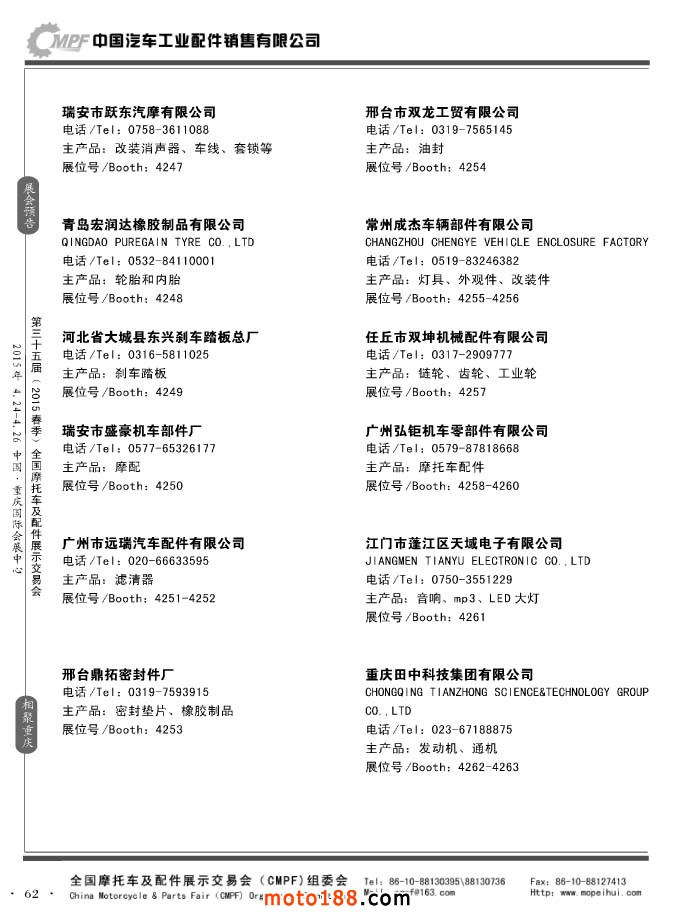 ”全國(guó)摩托車(chē)及配件展示會(huì)“(CMPF)是中國(guó)摩托車(chē)行業(yè)的傳統(tǒng)盛會(huì),自1981年至今已成功舉辦了67季次(每年春、秋季各舉辦一次),現(xiàn)已發(fā)展成為行業(yè)內(nèi)規(guī)模最大、專(zhuān)業(yè)觀眾最多、影響最廣泛、參展商最有收獲的全國(guó)性品牌展會(huì)。CMPF展會(huì)聚集了全國(guó)大部分摩托車(chē)配件生產(chǎn)企業(yè)與流通企業(yè),是產(chǎn)需雙方進(jìn)行貿(mào)易洽談、新產(chǎn)品技術(shù)推廣與交流的理想服務(wù)平臺(tái)。