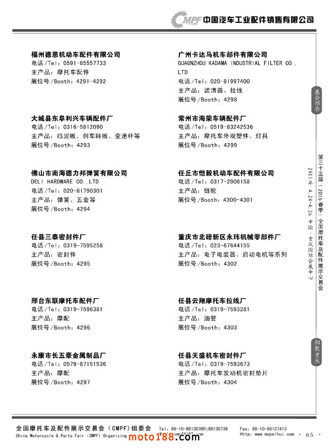 ”全國摩托車及配件展示會“(CMPF)是中國摩托車行業(yè)的傳統(tǒng)盛會,自1981年至今已成功舉辦了67季次(每年春、秋季各舉辦一次),現(xiàn)已發(fā)展成為行業(yè)內(nèi)規(guī)模最大、專業(yè)觀眾最多、影響最廣泛、參展商最有收獲的全國性品牌展會。CMPF展會聚集了全國大部分摩托車配件生產(chǎn)企業(yè)與流通企業(yè),是產(chǎn)需雙方進行貿(mào)易洽談、新產(chǎn)品技術推廣與交流的理想服務平臺。
