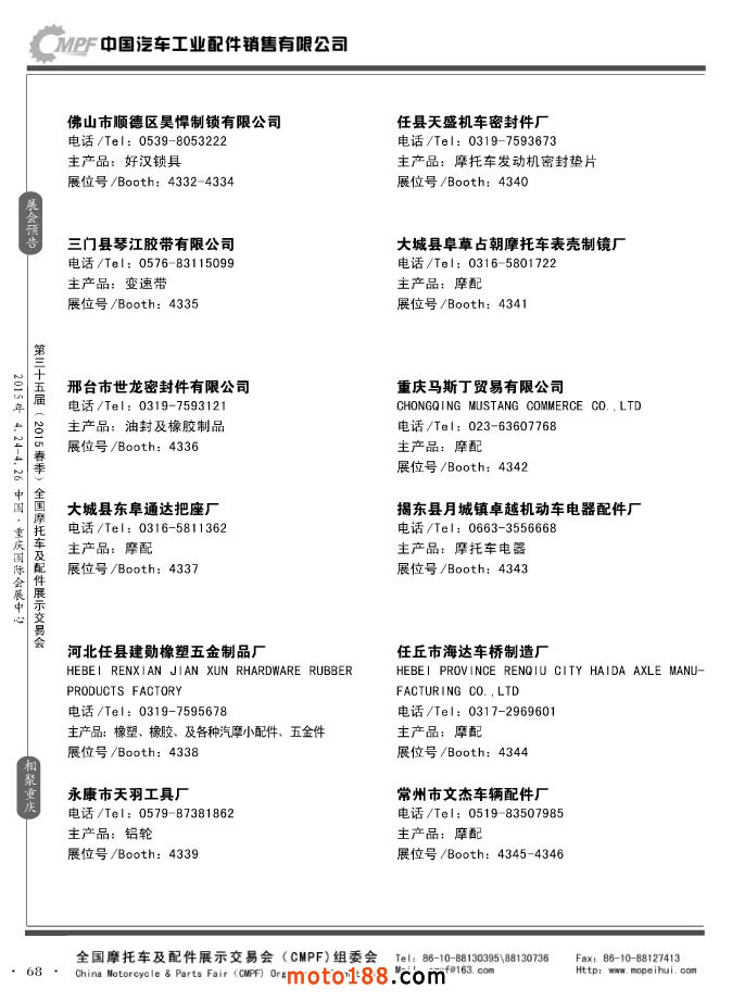 ”全國摩托車及配件展示會“(CMPF)是中國摩托車行業的傳統盛會,自1981年至今已成功舉辦了67季次(每年春、秋季各舉辦一次),現已發展成為行業內規模最大、專業觀眾最多、影響最廣泛、參展商最有收獲的全國性品牌展會。CMPF展會聚集了全國大部分摩托車配件生產企業與流通企業,是產需雙方進行貿易洽談、新產品技術推廣與交流的理想服務平臺。