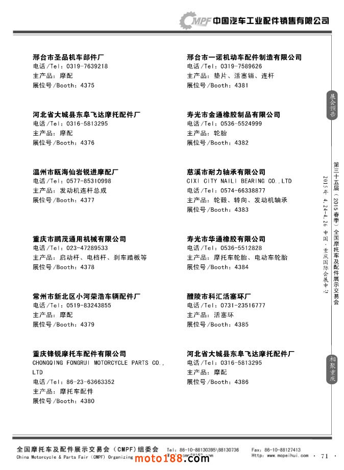 ”全國摩托車及配件展示會“(CMPF)是中國摩托車行業(yè)的傳統(tǒng)盛會,自1981年至今已成功舉辦了67季次(每年春、秋季各舉辦一次),現(xiàn)已發(fā)展成為行業(yè)內(nèi)規(guī)模最大、專業(yè)觀眾最多、影響最廣泛、參展商最有收獲的全國性品牌展會。CMPF展會聚集了全國大部分摩托車配件生產(chǎn)企業(yè)與流通企業(yè),是產(chǎn)需雙方進行貿(mào)易洽談、新產(chǎn)品技術(shù)推廣與交流的理想服務平臺。