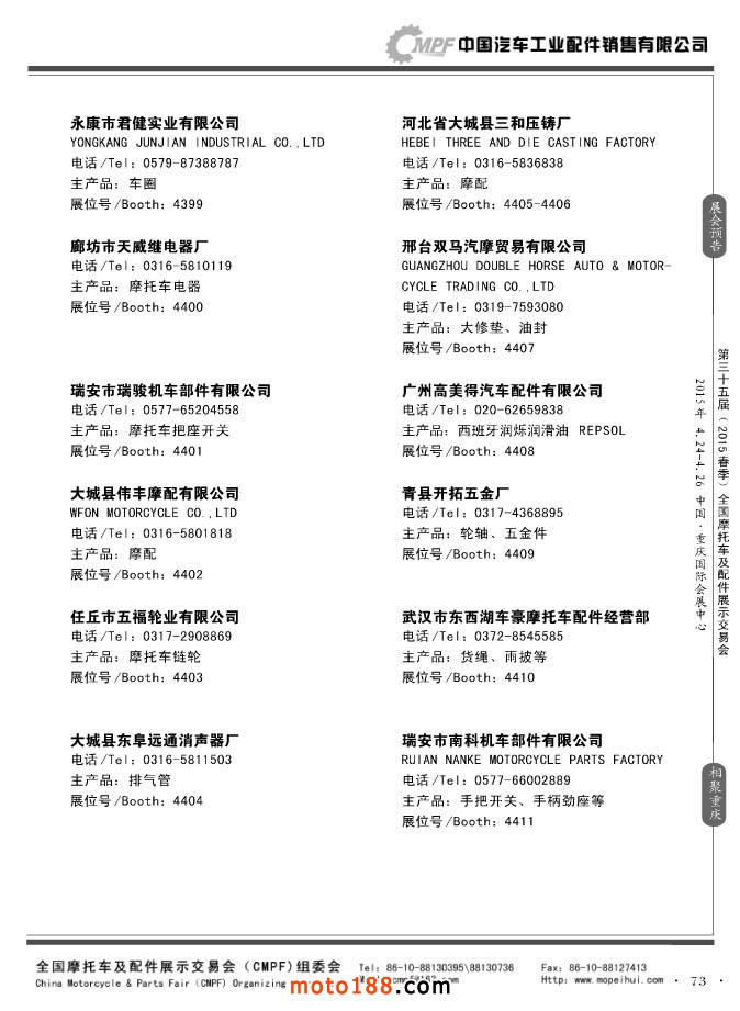 ”全國摩托車及配件展示會“(CMPF)是中國摩托車行業的傳統盛會,自1981年至今已成功舉辦了67季次(每年春、秋季各舉辦一次),現已發展成為行業內規模最大、專業觀眾最多、影響最廣泛、參展商最有收獲的全國性品牌展會。CMPF展會聚集了全國大部分摩托車配件生產企業與流通企業,是產需雙方進行貿易洽談、新產品技術推廣與交流的理想服務平臺。