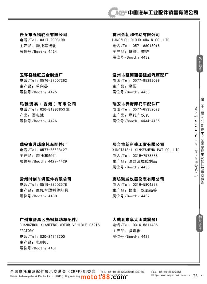 ”全國摩托車及配件展示會“(CMPF)是中國摩托車行業的傳統盛會,自1981年至今已成功舉辦了67季次(每年春、秋季各舉辦一次),現已發展成為行業內規模最大、專業觀眾最多、影響最廣泛、參展商最有收獲的全國性品牌展會。CMPF展會聚集了全國大部分摩托車配件生產企業與流通企業,是產需雙方進行貿易洽談、新產品技術推廣與交流的理想服務平臺。