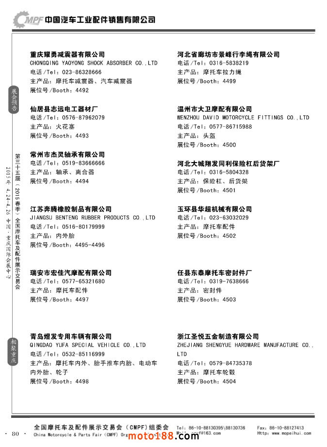 ”全國(guó)摩托車及配件展示會(huì)“(CMPF)是中國(guó)摩托車行業(yè)的傳統(tǒng)盛會(huì),自1981年至今已成功舉辦了67季次(每年春、秋季各舉辦一次),現(xiàn)已發(fā)展成為行業(yè)內(nèi)規(guī)模最大、專業(yè)觀眾最多、影響最廣泛、參展商最有收獲的全國(guó)性品牌展會(huì)。CMPF展會(huì)聚集了全國(guó)大部分摩托車配件生產(chǎn)企業(yè)與流通企業(yè),是產(chǎn)需雙方進(jìn)行貿(mào)易洽談、新產(chǎn)品技術(shù)推廣與交流的理想服務(wù)平臺(tái)。