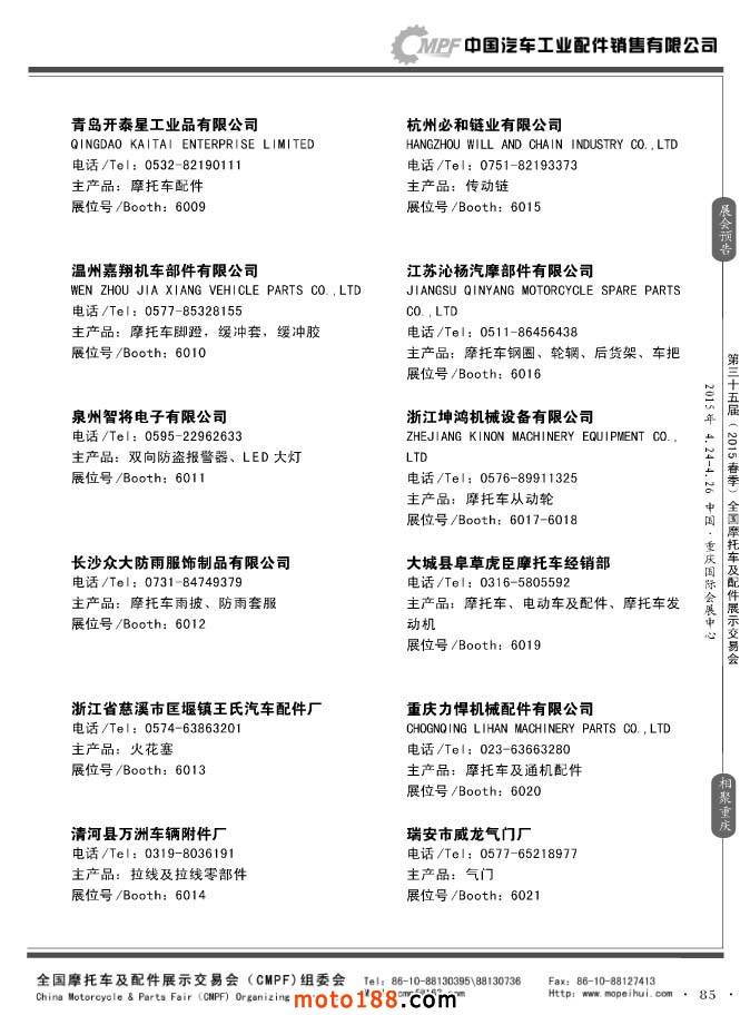 ”全國摩托車及配件展示會“(CMPF)是中國摩托車行業(yè)的傳統(tǒng)盛會,自1981年至今已成功舉辦了67季次(每年春、秋季各舉辦一次),現(xiàn)已發(fā)展成為行業(yè)內(nèi)規(guī)模最大、專業(yè)觀眾最多、影響最廣泛、參展商最有收獲的全國性品牌展會。CMPF展會聚集了全國大部分摩托車配件生產(chǎn)企業(yè)與流通企業(yè),是產(chǎn)需雙方進(jìn)行貿(mào)易洽談、新產(chǎn)品技術(shù)推廣與交流的理想服務(wù)平臺。