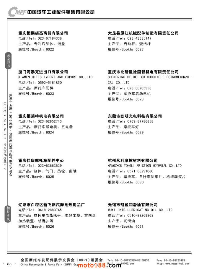 ”全國摩托車及配件展示會“(CMPF)是中國摩托車行業(yè)的傳統(tǒng)盛會,自1981年至今已成功舉辦了67季次(每年春、秋季各舉辦一次),現(xiàn)已發(fā)展成為行業(yè)內(nèi)規(guī)模最大、專業(yè)觀眾最多、影響最廣泛、參展商最有收獲的全國性品牌展會。CMPF展會聚集了全國大部分摩托車配件生產(chǎn)企業(yè)與流通企業(yè),是產(chǎn)需雙方進(jìn)行貿(mào)易洽談、新產(chǎn)品技術(shù)推廣與交流的理想服務(wù)平臺。