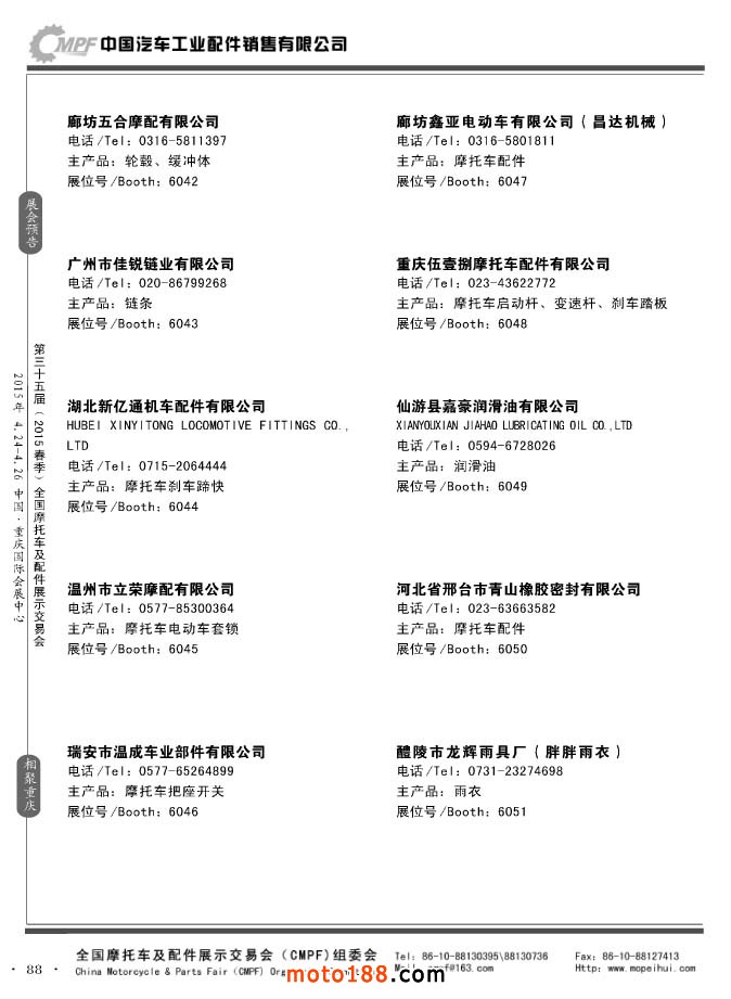 ”全國摩托車及配件展示會“(CMPF)是中國摩托車行業的傳統盛會,自1981年至今已成功舉辦了67季次(每年春、秋季各舉辦一次),現已發展成為行業內規模最大、專業觀眾最多、影響最廣泛、參展商最有收獲的全國性品牌展會。CMPF展會聚集了全國大部分摩托車配件生產企業與流通企業,是產需雙方進行貿易洽談、新產品技術推廣與交流的理想服務平臺。