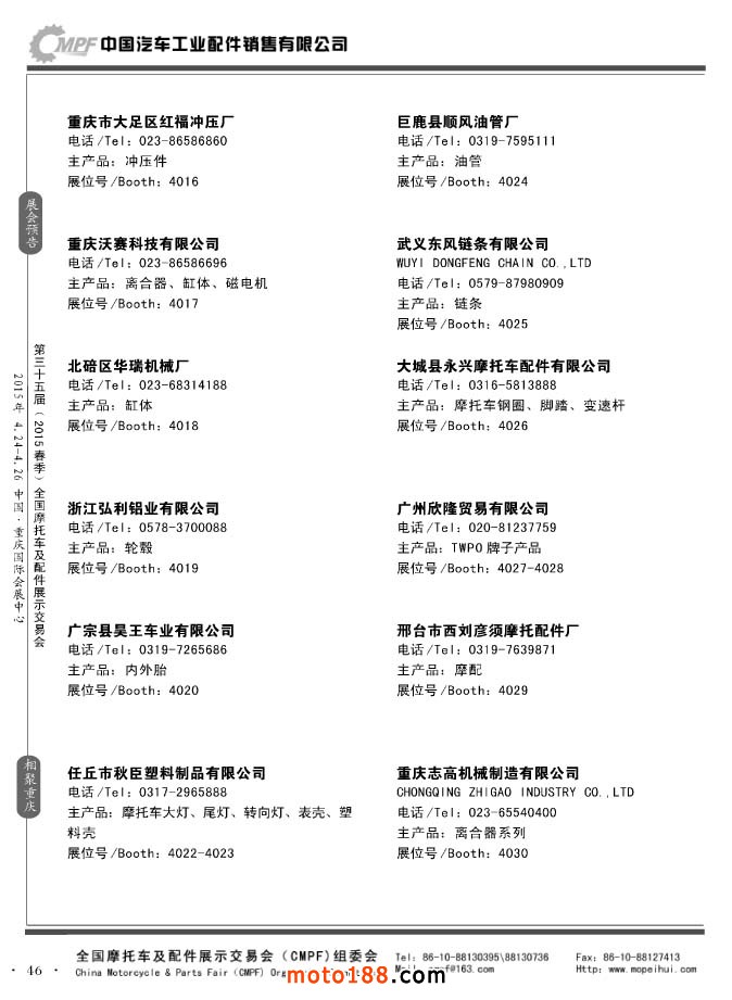 ”全國摩托車及配件展示會“(CMPF)是中國摩托車行業的傳統盛會,自1981年至今已成功舉辦了67季次(每年春、秋季各舉辦一次),現已發展成為行業內規模最大、專業觀眾最多、影響最廣泛、參展商最有收獲的全國性品牌展會。CMPF展會聚集了全國大部分摩托車配件生產企業與流通企業,是產需雙方進行貿易洽談、新產品技術推廣與交流的理想服務平臺。