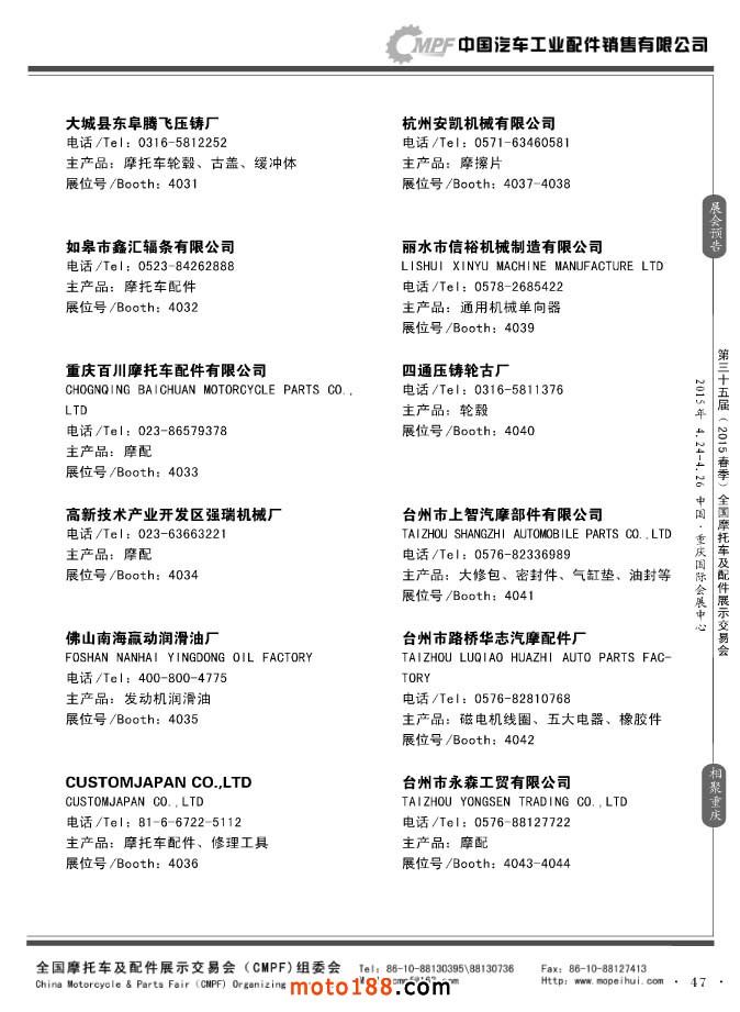 ”全國(guó)摩托車及配件展示會(huì)“(CMPF)是中國(guó)摩托車行業(yè)的傳統(tǒng)盛會(huì),自1981年至今已成功舉辦了67季次(每年春、秋季各舉辦一次),現(xiàn)已發(fā)展成為行業(yè)內(nèi)規(guī)模最大、專業(yè)觀眾最多、影響最廣泛、參展商最有收獲的全國(guó)性品牌展會(huì)。CMPF展會(huì)聚集了全國(guó)大部分摩托車配件生產(chǎn)企業(yè)與流通企業(yè),是產(chǎn)需雙方進(jìn)行貿(mào)易洽談、新產(chǎn)品技術(shù)推廣與交流的理想服務(wù)平臺(tái)。