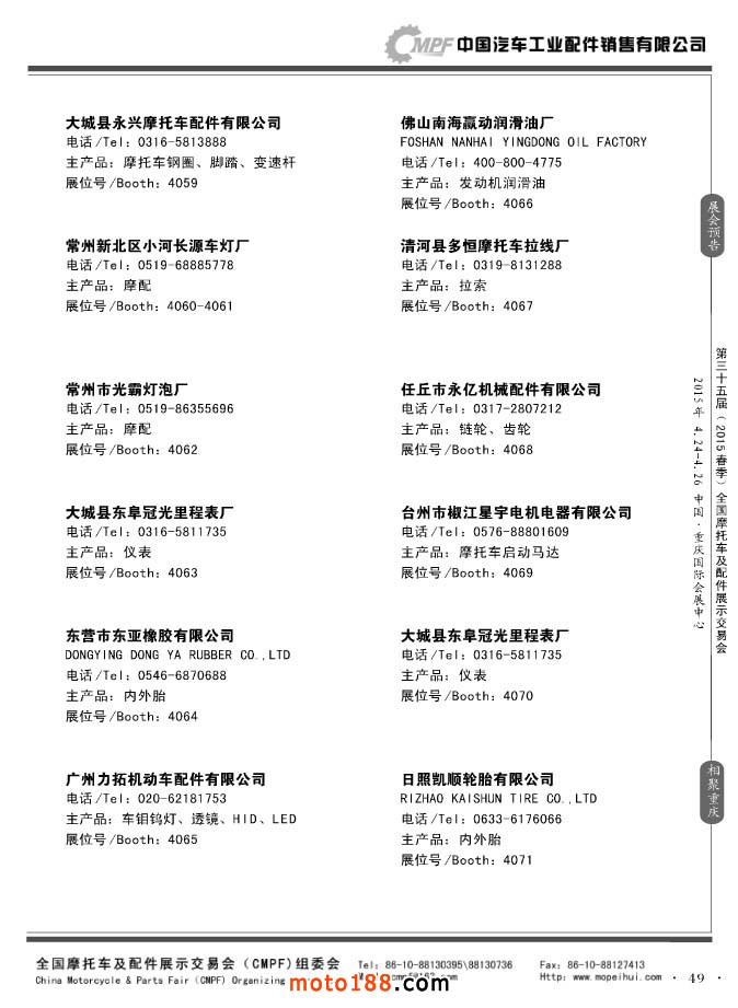 ”全國摩托車及配件展示會(huì)“(CMPF)是中國摩托車行業(yè)的傳統(tǒng)盛會(huì),自1981年至今已成功舉辦了67季次(每年春、秋季各舉辦一次),現(xiàn)已發(fā)展成為行業(yè)內(nèi)規(guī)模最大、專業(yè)觀眾最多、影響最廣泛、參展商最有收獲的全國性品牌展會(huì)。CMPF展會(huì)聚集了全國大部分摩托車配件生產(chǎn)企業(yè)與流通企業(yè),是產(chǎn)需雙方進(jìn)行貿(mào)易洽談、新產(chǎn)品技術(shù)推廣與交流的理想服務(wù)平臺(tái)。