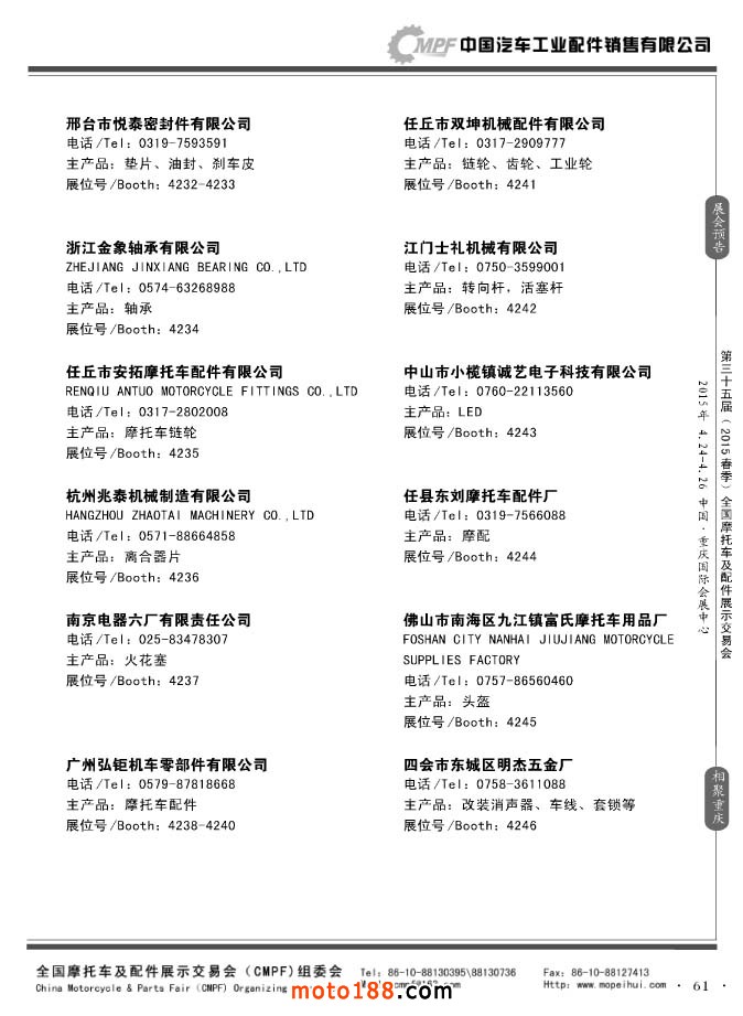 ”全國摩托車及配件展示會“(CMPF)是中國摩托車行業(yè)的傳統(tǒng)盛會,自1981年至今已成功舉辦了67季次(每年春、秋季各舉辦一次),現(xiàn)已發(fā)展成為行業(yè)內(nèi)規(guī)模最大、專業(yè)觀眾最多、影響最廣泛、參展商最有收獲的全國性品牌展會。CMPF展會聚集了全國大部分摩托車配件生產(chǎn)企業(yè)與流通企業(yè),是產(chǎn)需雙方進(jìn)行貿(mào)易洽談、新產(chǎn)品技術(shù)推廣與交流的理想服務(wù)平臺。