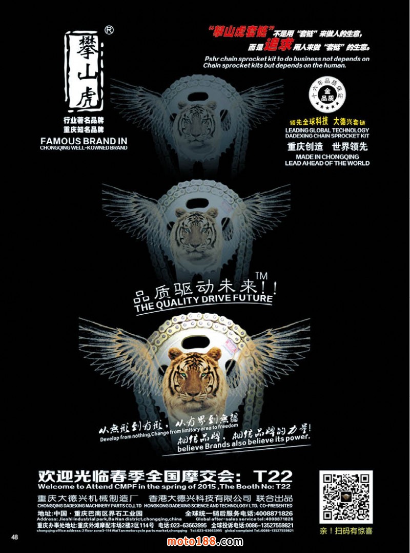 2015年的春天姍姍來遲,行業的盛會卻已盛裝已待。今春我們聚集在中國也是世界最大的摩托車配件生產基地重慶。目前行業形勢一如國家的經濟形勢依然嚴峻,但是我們摩配行業的從業人員,頂住困難以堅韌不拔的毅力,不離不棄奮斗在這個行業,通過重慶這樣一個大的展示平臺展示我們行業的精氣神。我們也帶來了這半年的勞動成果,和大家分享。