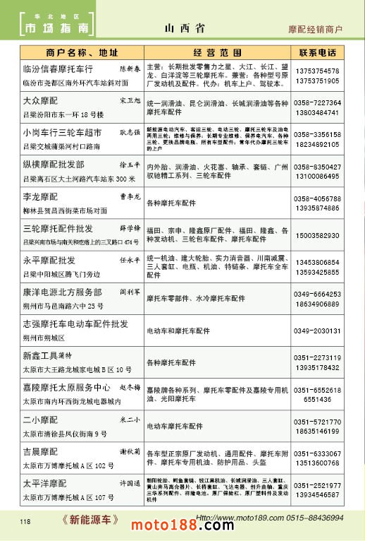 中國摩配市場從上世紀九十年代開始經過高速度的發展,正逐步減速,摩托車行業也漸呈式微,與之緊密相關的后市場的配件與維修也呈逐步下滑之勢,取代摩托車的在發達地區是汽車,欠發達地區是電動兩輪、電動三輪,甚至電動四輪車,隨著經濟的發展,出行的多樣化,也給了消費者多重的選擇。目前現有的摩托車及配件市場,也不再是以純摩托車為主體,有的市場電動車取代了摩托車,有的商店也是混合經營,這些變化在《市場指南》里面都有所反應。這次《北方指南》一些小市場不再單列,并入到相應的省份中去;以前去市場的公交線路,書中也不再列入,因為現在的地圖導航功能十分強大,既新又準。