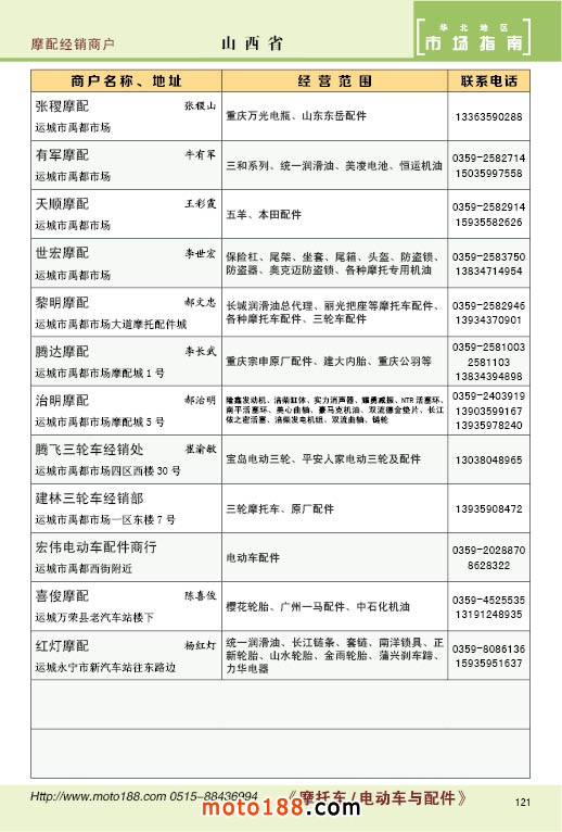 中國摩配市場從上世紀(jì)九十年代開始經(jīng)過高速度的發(fā)展,正逐步減速,摩托車行業(yè)也漸呈式微,與之緊密相關(guān)的后市場的配件與維修也呈逐步下滑之勢,取代摩托車的在發(fā)達(dá)地區(qū)是汽車,欠發(fā)達(dá)地區(qū)是電動兩輪、電動三輪,甚至電動四輪車,隨著經(jīng)濟(jì)的發(fā)展,出行的多樣化,也給了消費(fèi)者多重的選擇。目前現(xiàn)有的摩托車及配件市場,也不再是以純摩托車為主體,有的市場電動車取代了摩托車,有的商店也是混合經(jīng)營,這些變化在《市場指南》里面都有所反應(yīng)。這次《北方指南》一些小市場不再單列,并入到相應(yīng)的省份中去;以前去市場的公交線路,書中也不再列入,因?yàn)楝F(xiàn)在的地圖導(dǎo)航功能十分強(qiáng)大,既新又準(zhǔn)。
