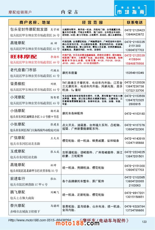 中國摩配市場從上世紀九十年代開始經過高速度的發展,正逐步減速,摩托車行業也漸呈式微,與之緊密相關的后市場的配件與維修也呈逐步下滑之勢,取代摩托車的在發達地區是汽車,欠發達地區是電動兩輪、電動三輪,甚至電動四輪車,隨著經濟的發展,出行的多樣化,也給了消費者多重的選擇。目前現有的摩托車及配件市場,也不再是以純摩托車為主體,有的市場電動車取代了摩托車,有的商店也是混合經營,這些變化在《市場指南》里面都有所反應。這次《北方指南》一些小市場不再單列,并入到相應的省份中去;以前去市場的公交線路,書中也不再列入,因為現在的地圖導航功能十分強大,既新又準。