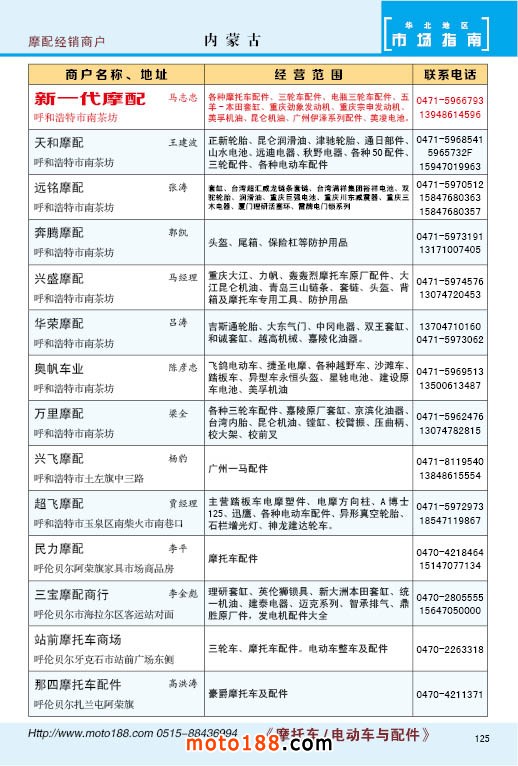 內125 內蒙古自治區摩配經銷商戶
