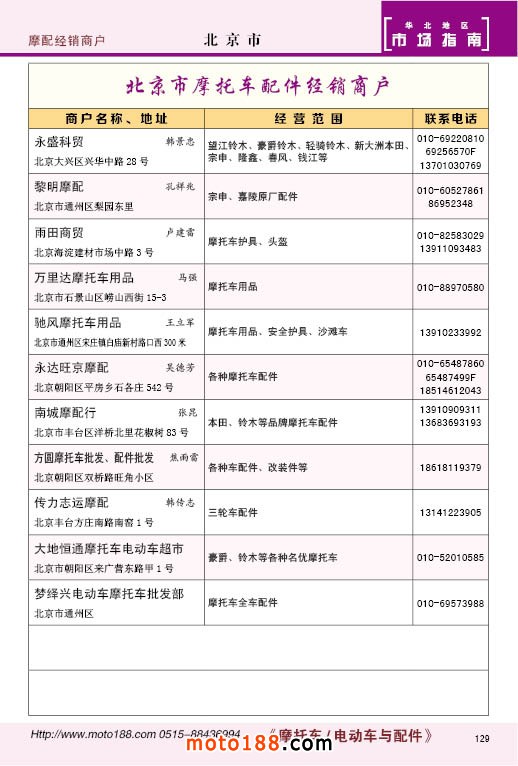 中國摩配市場從上世紀九十年代開始經過高速度的發(fā)展,正逐步減速,摩托車行業(yè)也漸呈式微,與之緊密相關的后市場的配件與維修也呈逐步下滑之勢,取代摩托車的在發(fā)達地區(qū)是汽車,欠發(fā)達地區(qū)是電動兩輪、電動三輪,甚至電動四輪車,隨著經濟的發(fā)展,出行的多樣化,也給了消費者多重的選擇。目前現有的摩托車及配件市場,也不再是以純摩托車為主體,有的市場電動車取代了摩托車,有的商店也是混合經營,這些變化在《市場指南》里面都有所反應。這次《北方指南》一些小市場不再單列,并入到相應的省份中去;以前去市場的公交線路,書中也不再列入,因為現在的地圖導航功能十分強大,既新又準。