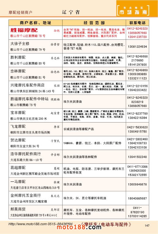 中國摩配市場從上世紀九十年代開始經過高速度的發(fā)展,正逐步減速,摩托車行業(yè)也漸呈式微,與之緊密相關的后市場的配件與維修也呈逐步下滑之勢,取代摩托車的在發(fā)達地區(qū)是汽車,欠發(fā)達地區(qū)是電動兩輪、電動三輪,甚至電動四輪車,隨著經濟的發(fā)展,出行的多樣化,也給了消費者多重的選擇。目前現(xiàn)有的摩托車及配件市場,也不再是以純摩托車為主體,有的市場電動車取代了摩托車,有的商店也是混合經營,這些變化在《市場指南》里面都有所反應。這次《北方指南》一些小市場不再單列,并入到相應的省份中去;以前去市場的公交線路,書中也不再列入,因為現(xiàn)在的地圖導航功能十分強大,既新又準。