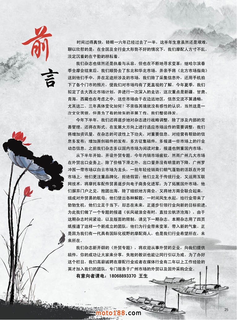從下半年開始,開設外貿專題。今年內銷市場疲軟,然而廣州幾大市場在外貿出口業務上,除了價格下滑之外,出口量并沒有明顯的下降,廣州羅沖圍一帶市場以白云市場為龍頭,一批年輕經銷商們朝氣蓬勃的活躍在外貿市場上,他們更注重品牌化,拒絕假冒;他們立足于傳統行業,又運用互聯網技術,將摩托車配件貿易逐步向電子商務化進軍;為了拓展國外市場,他們摒棄門戶之見,抱團出海,除了組織地方商會,又將地方商會聯合起來,組成對外貿易的航母;他們使出各種解數,一時間風生水起,給行業帶來了勃勃生機,他們立足于當下,卻志在未來,正逐步引領行業向新的目標前進,為此我們做了一個專題的報道《長風破浪會有時,直掛云帆濟滄?!罚捎谶@期雜志時間緊迫,以及版面的限制,請見下一期雜志。本期雜志用了四頁紙報道了這樣一個新成立的團隊,他們為行業帶來變革,帶入新的氣象。正是因為我們有一代具有國際化視野的摩配商人,也是我們行業希望所在,未來所在。
