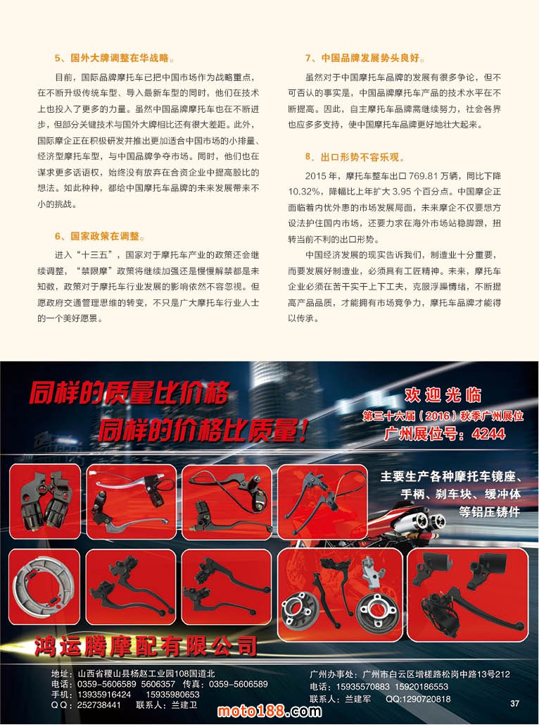 從下半年開始,開設(shè)外貿(mào)專題。今年內(nèi)銷市場疲軟,然而廣州幾大市場在外貿(mào)出口業(yè)務(wù)上,除了價格下滑之外,出口量并沒有明顯的下降,廣州羅沖圍一帶市場以白云市場為龍頭,一批年輕經(jīng)銷商們朝氣蓬勃的活躍在外貿(mào)市場上,他們更注重品牌化,拒絕假冒;他們立足于傳統(tǒng)行業(yè),又運(yùn)用互聯(lián)網(wǎng)技術(shù),將摩托車配件貿(mào)易逐步向電子商務(wù)化進(jìn)軍;為了拓展國外市場,他們摒棄門戶之見,抱團(tuán)出海,除了組織地方商會,又將地方商會聯(lián)合起來,組成對外貿(mào)易的航母;他們使出各種解數(shù),一時間風(fēng)生水起,給行業(yè)帶來了勃勃生機(jī),他們立足于當(dāng)下,卻志在未來,正逐步引領(lǐng)行業(yè)向新的目標(biāo)前進(jìn),為此我們做了一個專題的報道《長風(fēng)破浪會有時,直掛云帆濟(jì)滄海》,由于這期雜志時間緊迫,以及版面的限制,請見下一期雜志。本期雜志用了四頁紙報道了這樣一個新成立的團(tuán)隊,他們?yōu)樾袠I(yè)帶來變革,帶入新的氣象。正是因?yàn)槲覀冇幸淮哂袊H化視野的摩配商人,也是我們行業(yè)希望所在,未來所在。
