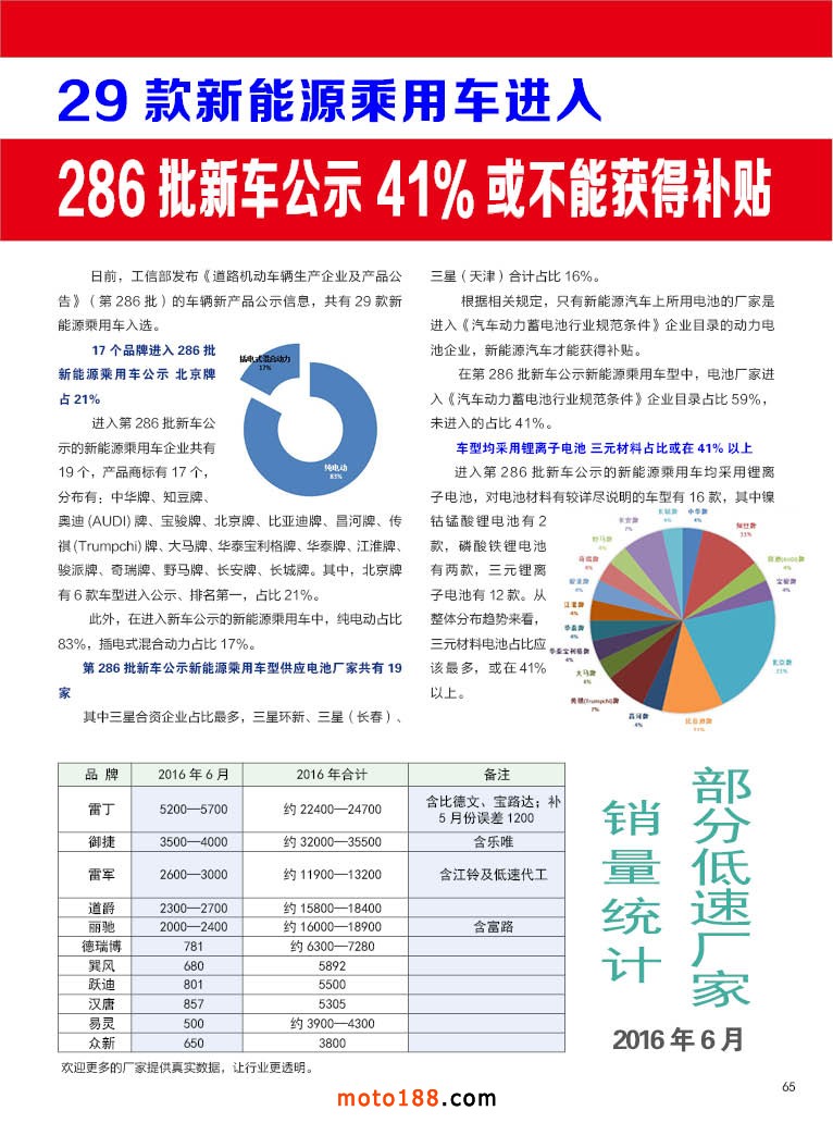內65 部分低速廠家6月份銷量統計