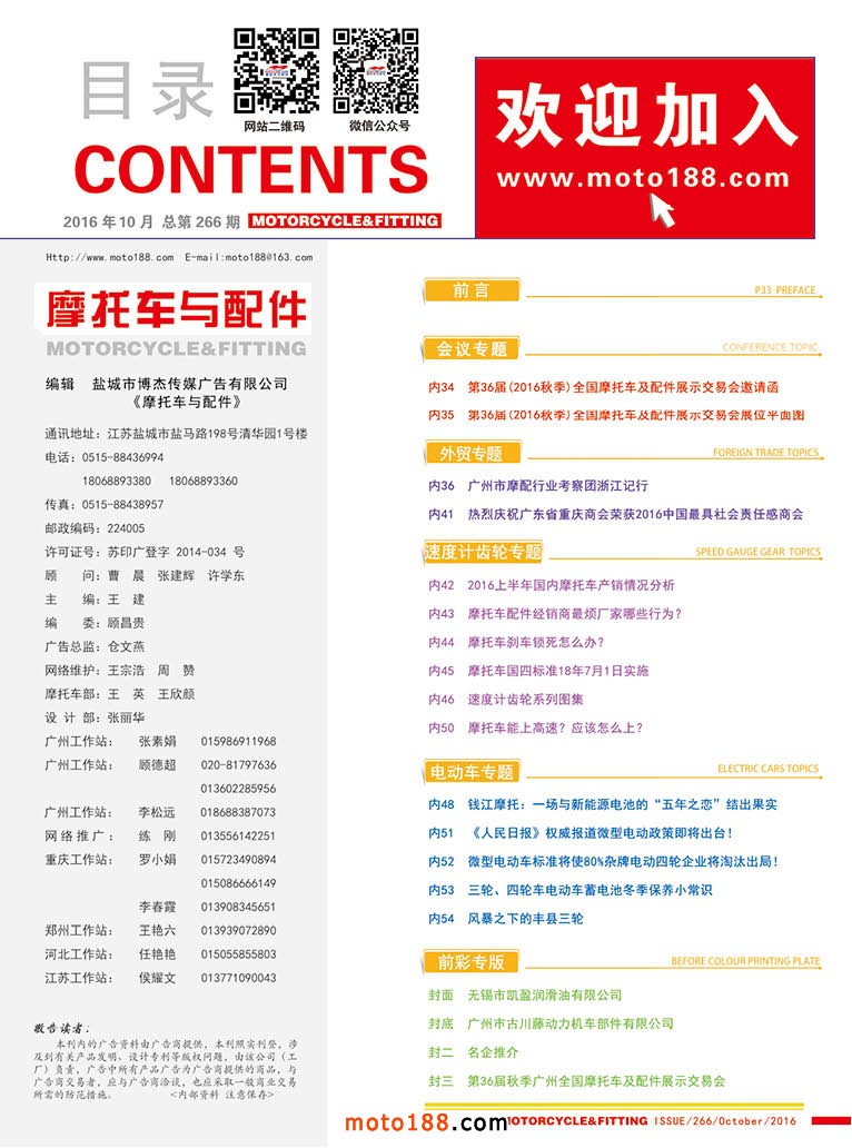 我們正一步步地穩妥的按照既定的計劃實施,同時努力發現和捕捉新的商機,隨時進行調整,下一期雜志就是在廣州全摩會上投放的,我們要突出外貿的主體和重點,從此后所有的廣告宣傳都采用中英文雙語出刊。由于內銷市場不景氣,摩托車配件的主要出處還是國際市場,目前我們已經在有行業半壁江山之稱的廣州加強了發行工作,做到全覆蓋,由于廣州市場駐點采購的外商較多,雙語出刊后,不僅方便他們閱讀,明年還將走出國門去國外市場推廣,同時結合互聯網技術,將雜志立體化的推進。