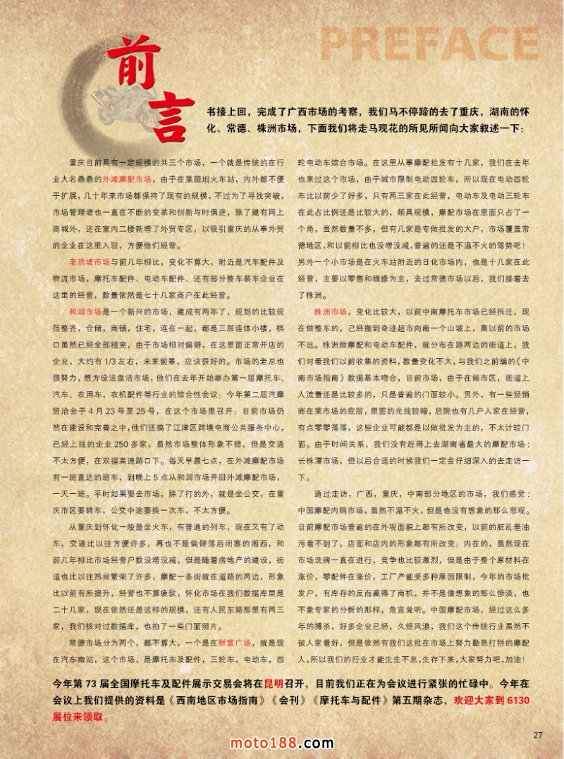 今年第73屆全國摩托車及配件展示交易會將在昆明召開,目前我們正在為會議進行緊張的忙碌中。今年在會議上我們提供的資料是《西南地區市場指南》《會刊》《摩托車與配件》第五期雜志,歡迎大家到6130展位來領取。