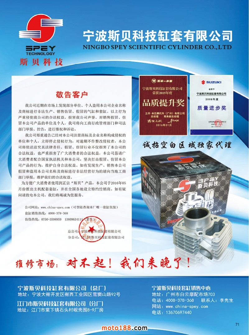 今年第73屆全國摩托車及配件展示交易會將在昆明召開,目前我們正在為會議進行緊張的忙碌中。今年在會議上我們提供的資料是《西南地區市場指南》《會刊》《摩托車與配件》第五期雜志,歡迎大家到6130展位來領取。