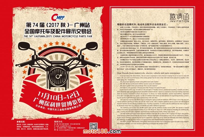 2017.6月《摩托車/電動車與配件》雜志,歡迎大家閱讀日期:2017-06-02 點擊:1297 查看原圖 全部展開![]() ![]() ![]() 彩拉 第74屆(2017秋)-廣州站全國摩托車及配件展示交易會邀請函